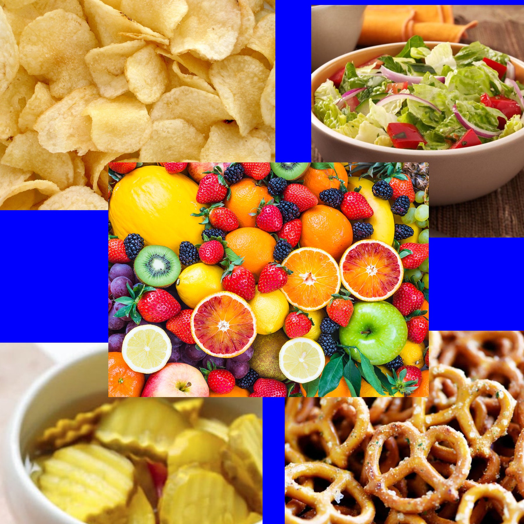 Chips, Seasoned Pretzels, Side Salad, Fruit (seasonal), Pickles